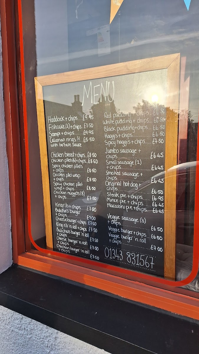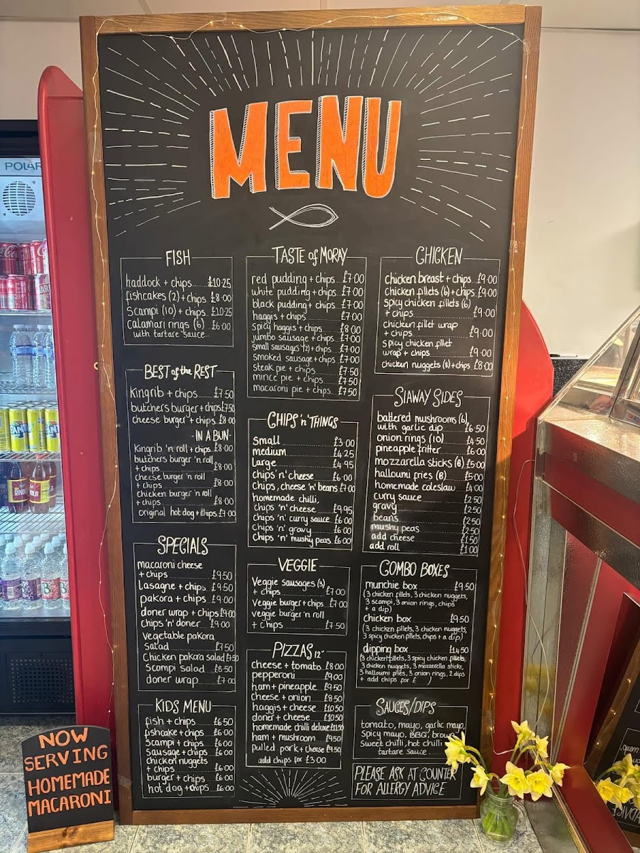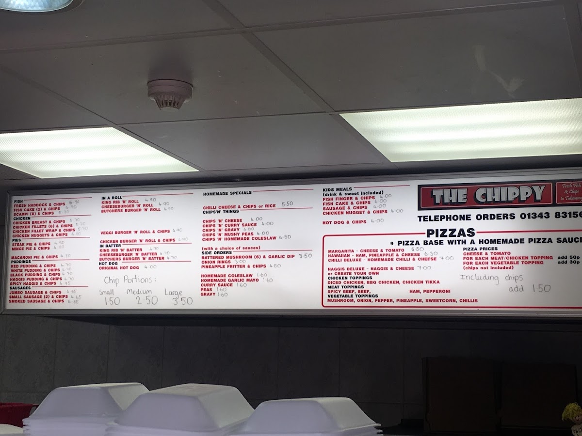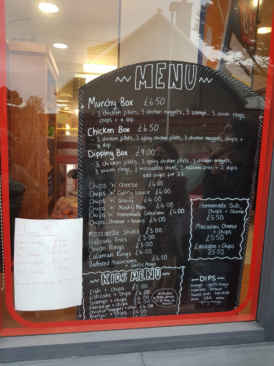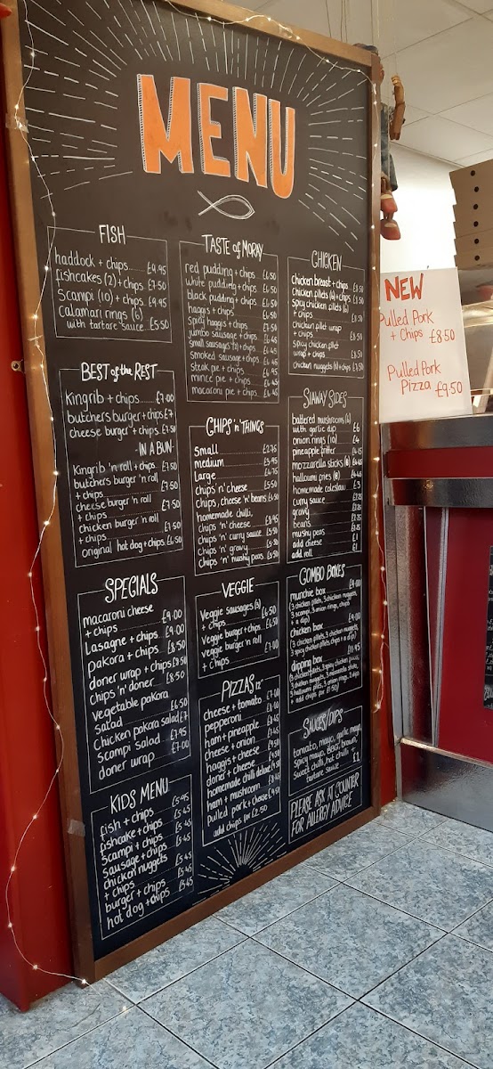 The menu at Hopeman Fish & Chip Company offers a variety of classic and comforting dishes, each with a distinct Scottish twist. For those craving traditional fish and chips, options include Haddock + chips, Fishcakes + chips, and Scampi + chips, while seafood lovers can enjoy the Calamari rings. The Best of the Rest section features hearty options like Kingrib + chips, Butchers burger + chips, and Cheese burger + chips, perfect for anyone seeking a more substantial meal. In the In a Bun category, dishes such as the Kingrib 'n roll + chips and Butchers burger 'n roll + chips offer an easy-to-eat alternative. For a taste of Moray, the menu showcases local delicacies like Red pudding + chips and Haggis + chips. If you're in the mood for chicken, there’s a range of choices including Chicken breast + chips and Spicy chicken fillets + chips, alongside wraps like the Chicken fillet wrap + chips. To complement the main courses, a selection of sides is available, from Battered mushrooms to Halloumi fries. The Chips 'n' Things section features various chip sizes, with fun toppings such as Chips 'n' cheese or Chips, cheese 'n' beans. The Specials menu presents comforting options like Macaroni cheese + chips and Lasagne + chips. For younger guests, the Kids Menu offers lighter options like Fish + chips or Chicken nuggets + chips. Vegetarians are well-catered for with choices like Veggie sausages + chips or a Veggie burger 'n roll + chips. For those seeking a slice of pizza, the 12" pizzas include classic combinations like Cheese + tomato and Ham + pineapple. The Combo Boxes are a great way to sample a range of flavors, such as the Munchie box and Chicken box. Finally, the restaurant offers a range of Sauces/Dips including Tomato, Mayo, and BBQ to complement your meal.