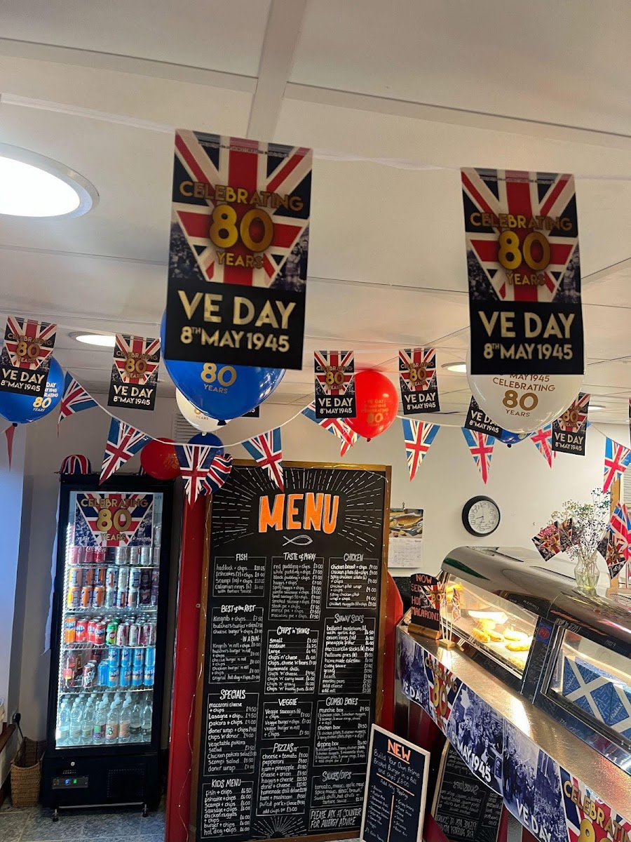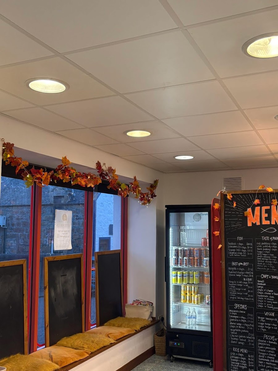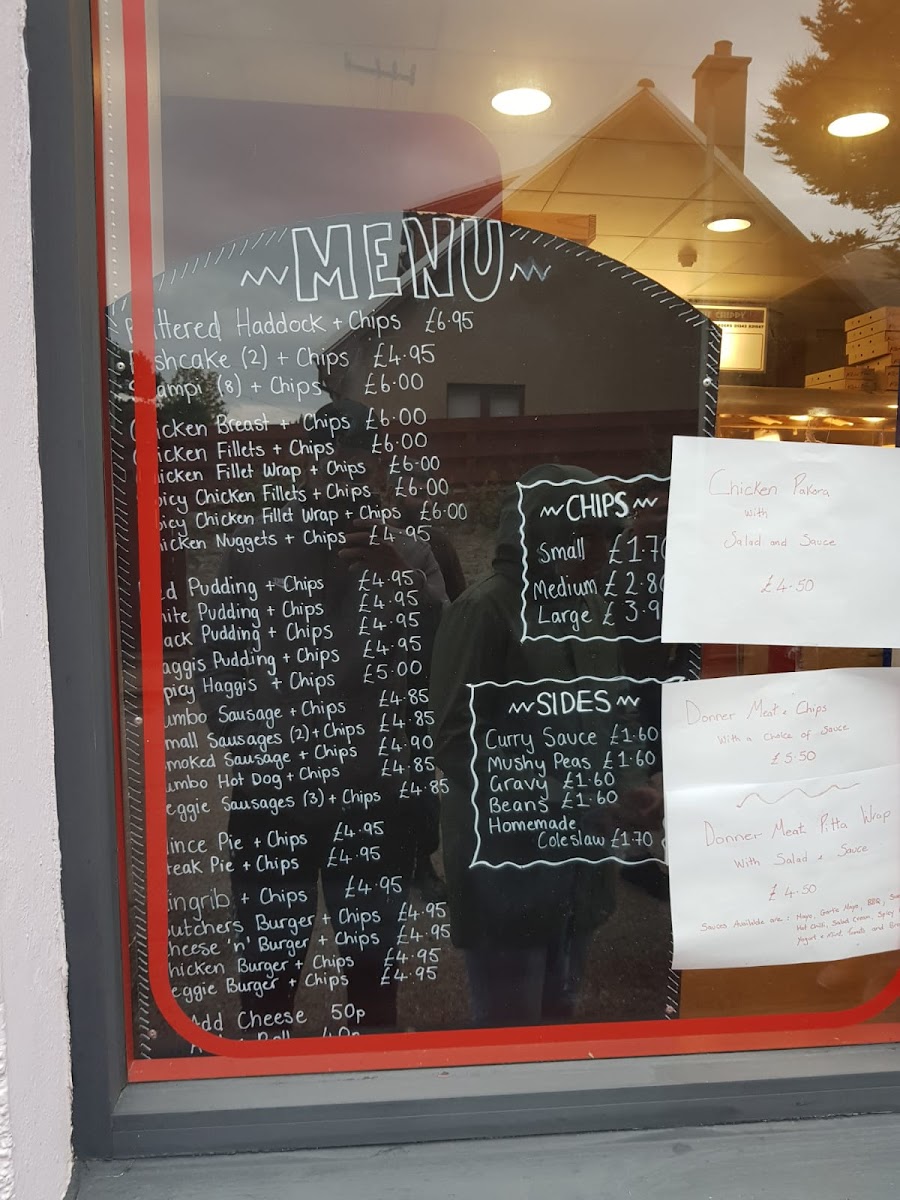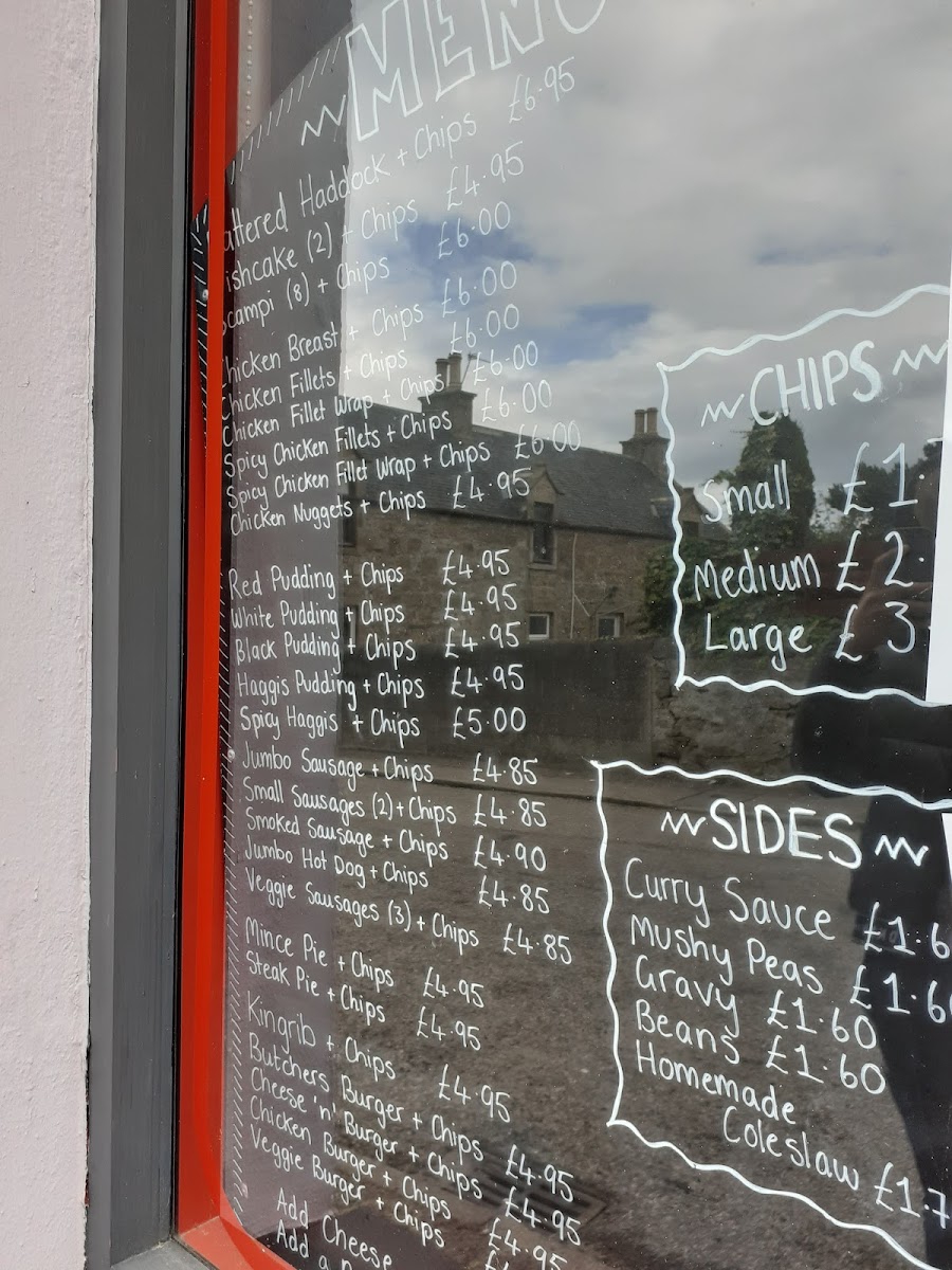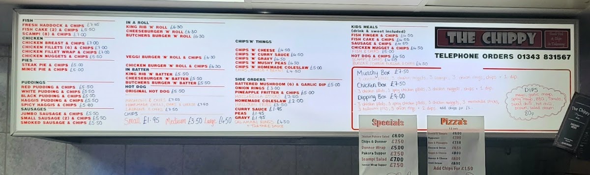 The menu at Hopeman Fish & Chip Company offers a variety of classic and comforting dishes, each with a distinct Scottish twist. For those craving traditional fish and chips, options include Haddock + chips, Fishcakes + chips, and Scampi + chips, while seafood lovers can enjoy the Calamari rings. The Best of the Rest section features hearty options like Kingrib + chips, Butchers burger + chips, and Cheese burger + chips, perfect for anyone seeking a more substantial meal. In the In a Bun category, dishes such as the Kingrib 'n roll + chips and Butchers burger 'n roll + chips offer an easy-to-eat alternative. For a taste of Moray, the menu showcases local delicacies like Red pudding + chips and Haggis + chips. If you're in the mood for chicken, there’s a range of choices including Chicken breast + chips and Spicy chicken fillets + chips, alongside wraps like the Chicken fillet wrap + chips. To complement the main courses, a selection of sides is available, from Battered mushrooms to Halloumi fries. The Chips 'n' Things section features various chip sizes, with fun toppings such as Chips 'n' cheese or Chips, cheese 'n' beans. The Specials menu presents comforting options like Macaroni cheese + chips and Lasagne + chips. For younger guests, the Kids Menu offers lighter options like Fish + chips or Chicken nuggets + chips. Vegetarians are well-catered for with choices like Veggie sausages + chips or a Veggie burger 'n roll + chips. For those seeking a slice of pizza, the 12" pizzas include classic combinations like Cheese + tomato and Ham + pineapple. The Combo Boxes are a great way to sample a range of flavors, such as the Munchie box and Chicken box. Finally, the restaurant offers a range of Sauces/Dips including Tomato, Mayo, and BBQ to complement your meal.